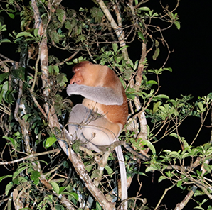 現地(ボルネオ島 キナバタンガン川下流域)での活動に、川岸の木の上で眠っているテングザルや川辺の茂みのカワセミ、ワニなどを観察するためのナイトクルーズを組み込んでいます。ボートに乗り込む頃にはすでに熱さは気になりません。川面にボートで出ていくと少し肌寒いくらいです。月明かりの下の黒と白の世界に入るとなぜか望郷の思いが湧いてきます。
